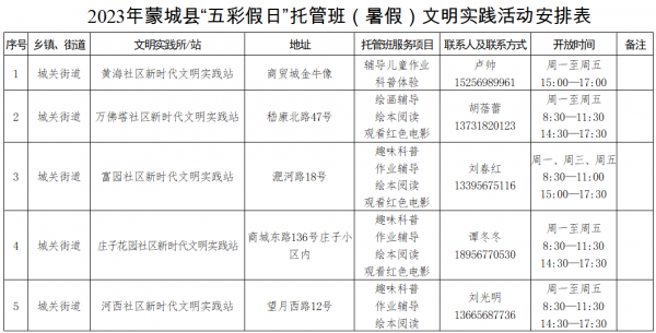 為滿足廣大家長需求、解決學(xué)生假期“看護(hù)難”問題,蒙城縣委宣傳部(文明辦)、蒙城縣新時代文明實踐中心決定在全縣開展2023年“五彩假日”托管班(暑假)文明實踐活動。