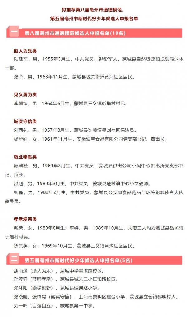 附件:擬推薦第八屆亳州市道德模范、第五屆亳州市新時(shí)代好少年申報(bào)名單