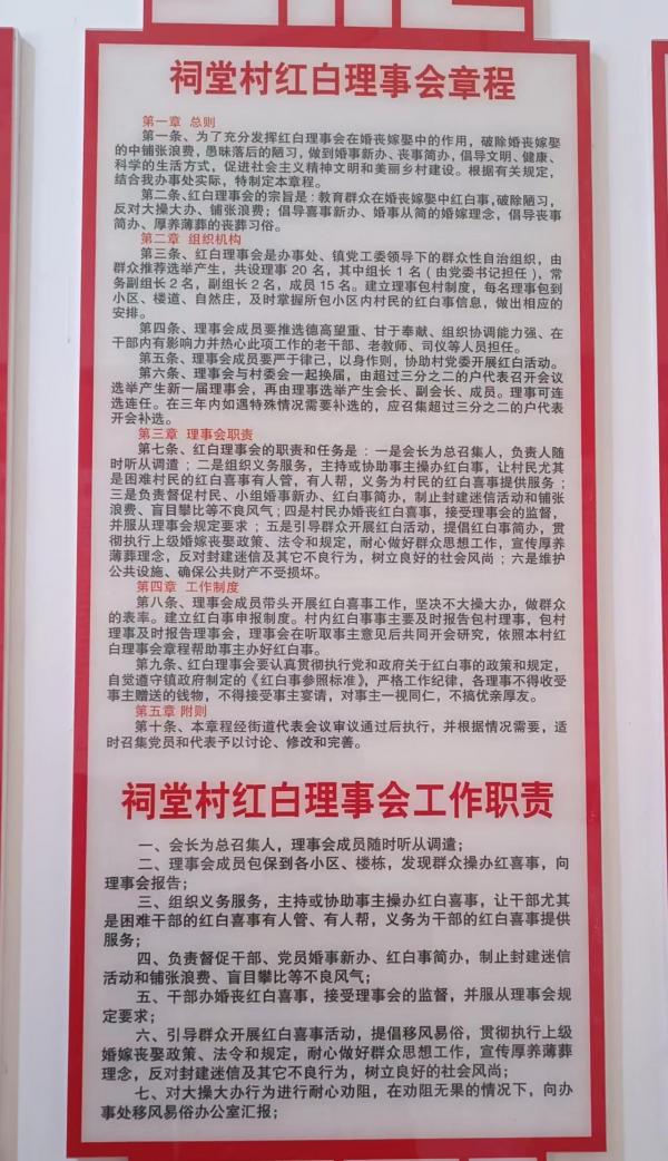 祠堂村廣泛征求村民意見建議,圍繞“社會(huì)治安、村風(fēng)民俗、鄰里關(guān)系、婚姻家庭、環(huán)境衛(wèi)生”等內(nèi)容召開村民會(huì)議,對(duì)村規(guī)民約進(jìn)行認(rèn)真討論,并出臺(tái)了《蒙城縣壇城鎮(zhèn)祠堂村村規(guī)民約》《蒙城縣壇城鎮(zhèn)祠堂村紅白理事會(huì)章程》等文件。這些文件對(duì)紅白事宴請(qǐng)餐數(shù)、彩禮、禮金等都做出了明確規(guī)定,為村民們辦理紅白事提供了明確的指導(dǎo)。把村規(guī)民約寫在紙上,掛在墻上,更是融進(jìn)群眾的心里,同時(shí)還充分發(fā)揮了紅白理事會(huì)這一村民自治組織,讓紅白理事會(huì)真正“理事”起來(lái)。