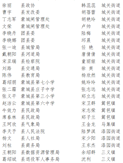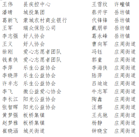 蒙城縣向日葵社工服務(wù)社、城關(guān)街道富園社區(qū)志愿服務(wù)隊、城關(guān)街道嵇康亭社區(qū)善之馨志愿服務(wù)隊、蒙城縣稅務(wù)局七彩陽光志愿服務(wù)隊、蒙城縣第二人民醫(yī)院白鴿志愿服務(wù)隊、莊周街道鯤鵬湖社區(qū)“蒙鯤姑娘”巾幗志愿服務(wù)隊、蒙城縣好人協(xié)會、蒙城縣愛心志愿者團(tuán)隊、許疃鎮(zhèn)吳劉社區(qū)志愿服務(wù)隊、莊周街道東光社區(qū)樂普志愿服務(wù)隊